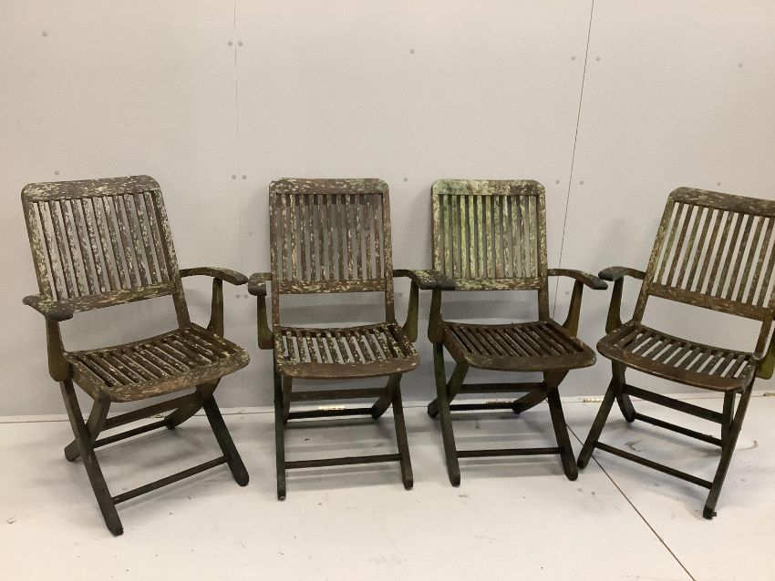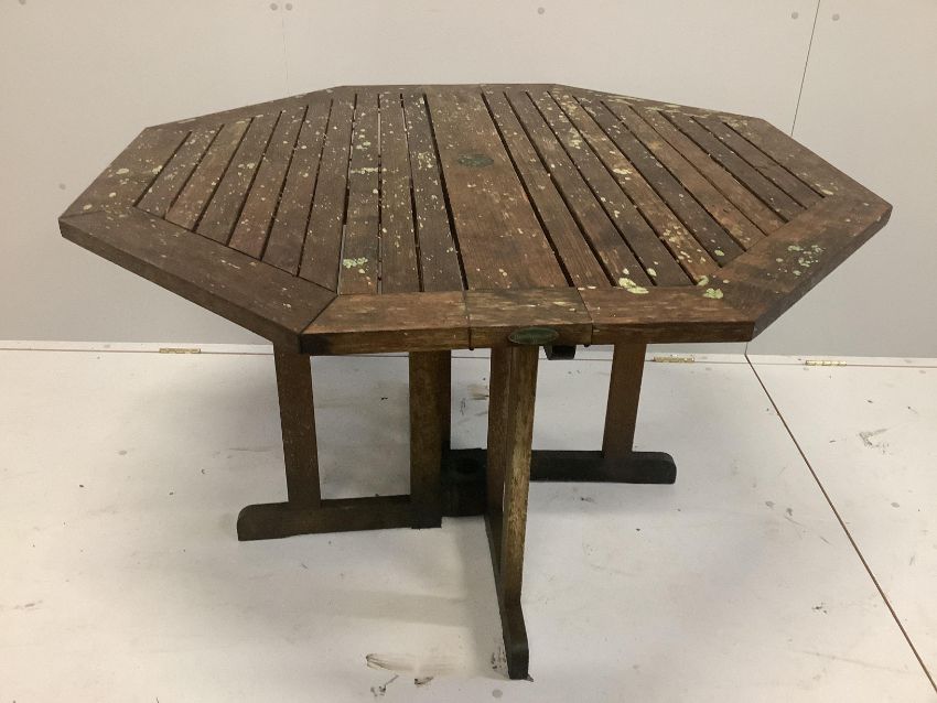 A weathered octagonal teak garden table, width 120cm, height 73cm and four chairs