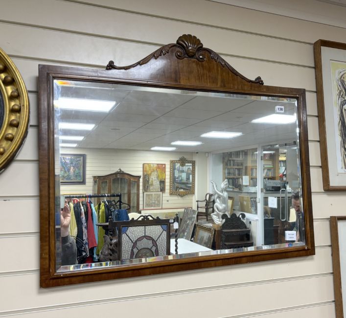 A Queen Anne revival walnut scallop crested wall mirror, width 91cm, height 77cm