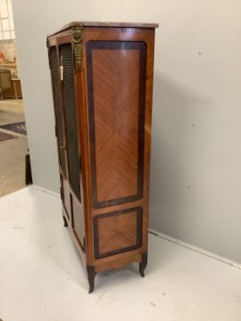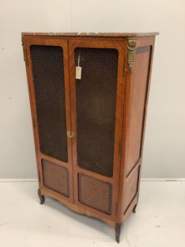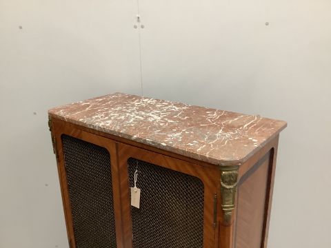 A French transitional style marble topped kingwood side cabinet, width 83cm, depth 40cm, height 145cm