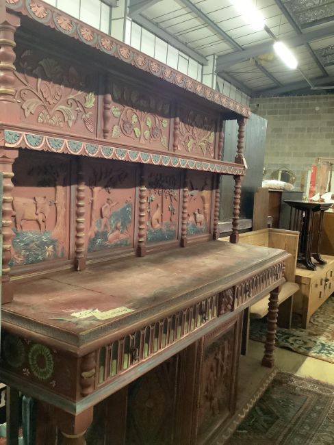 An early 20th century painted carved oak buffet, later painted, width 188cm, depth 55cm, height 182cm