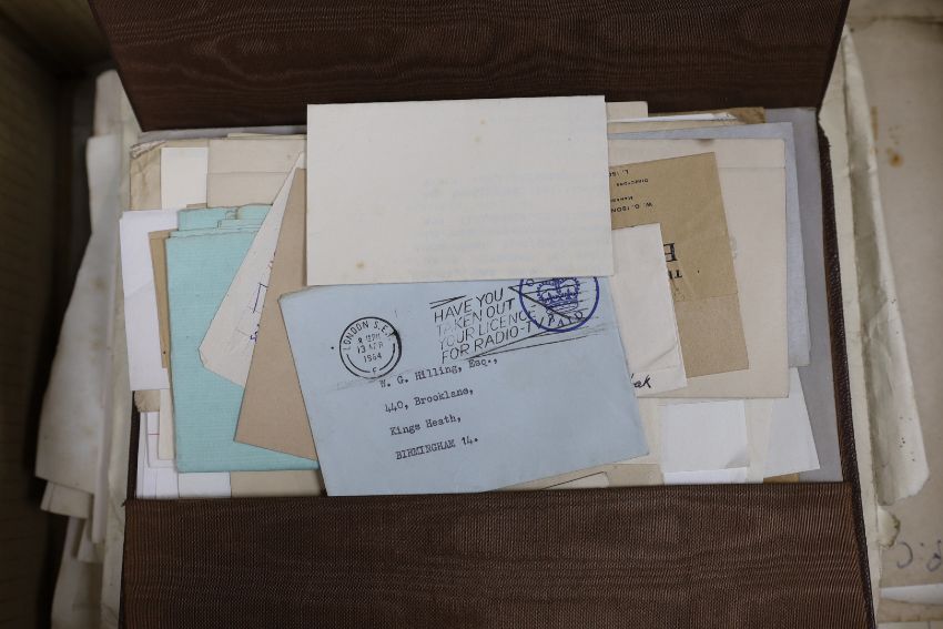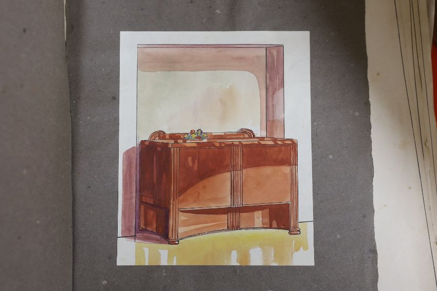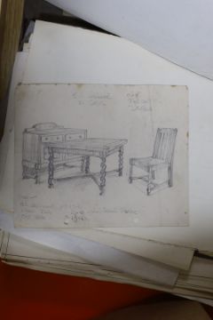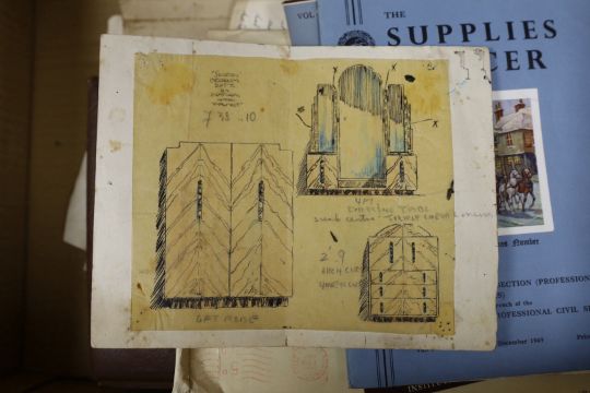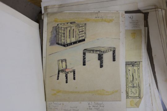 William Hilling (20th. C) collection of furniture illustrations, mostly ink and watercolour sketches on paper, including Art Deco designs, together with paperwork and ephemera related to the artist