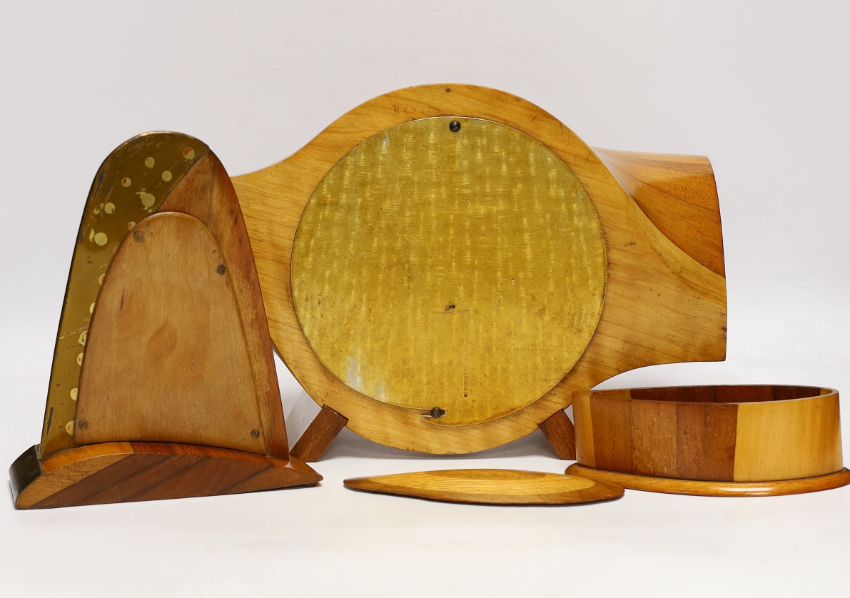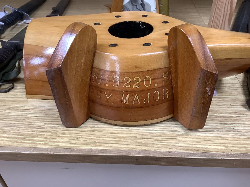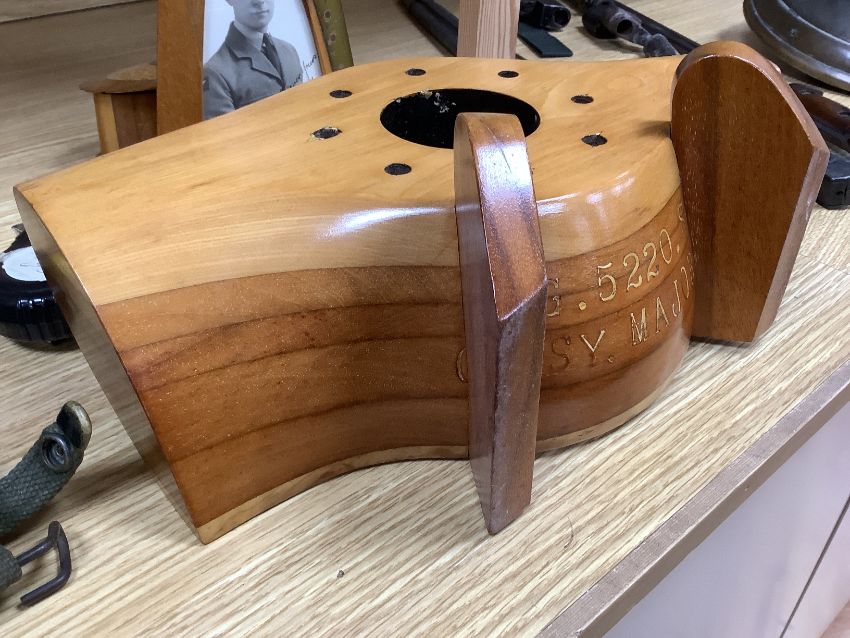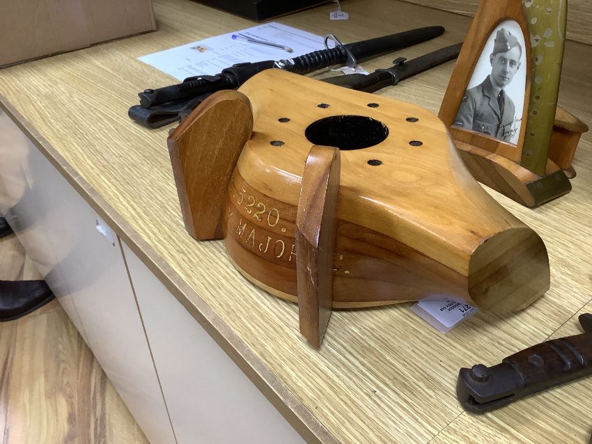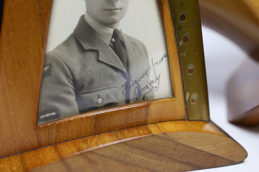 A WWII wooden propeller clock case, reputedly from a Spitfire related photo frame housing a black and white photograph of a soldier together with a trinket box, 35cm wide
