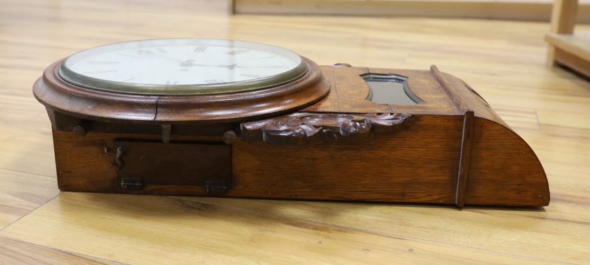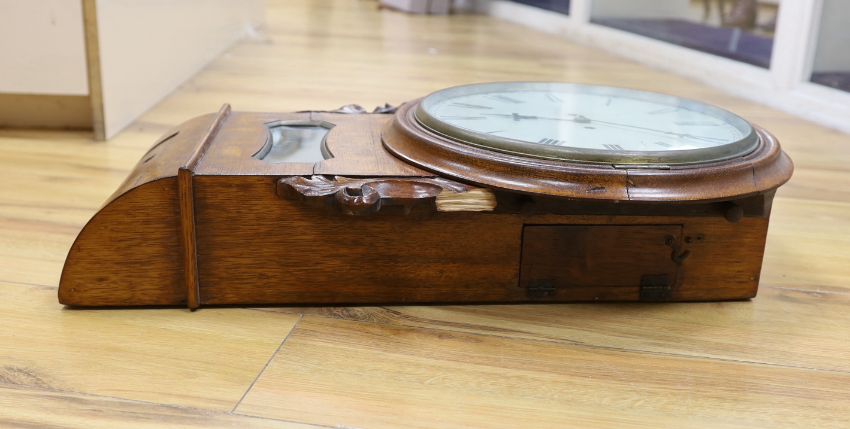 A 19th century oak eight day drop dial wall clock, with twin fusee movement, 65cm