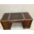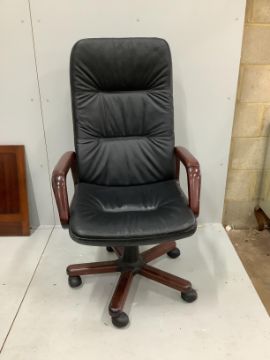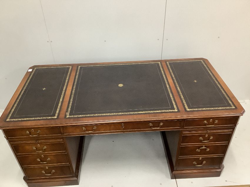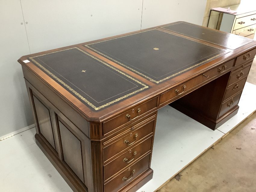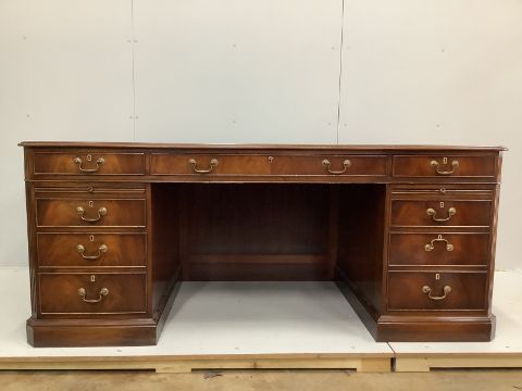 A reproduction George III style mahogany pedestal desk, width 180cm, depth 90cm, height 76cm together with a modern black leather and beech swivel desk chair