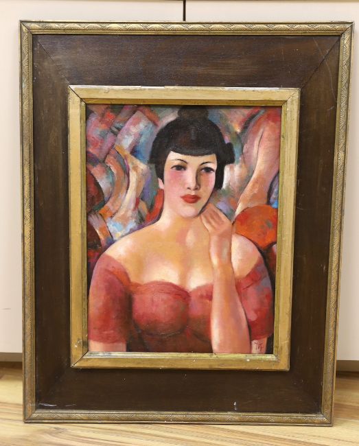 Oil on board, Head and shoulders portrait of a woman, 42 x 32cm This is a modern decorative painting.  Good condition; initialled lower right.