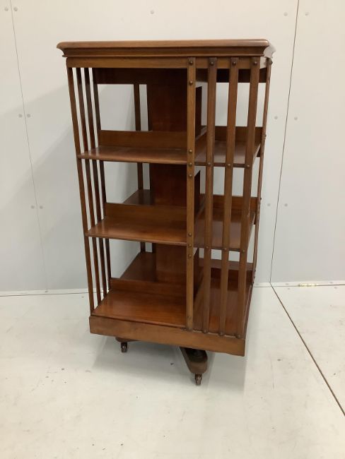 An early 20th century mahogany three tier revolving bookcase, width 60cm, depth 60cm, height 120cm