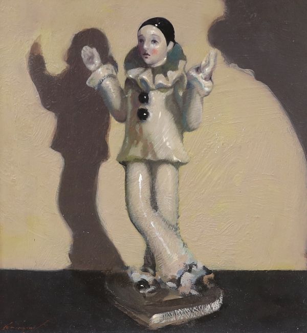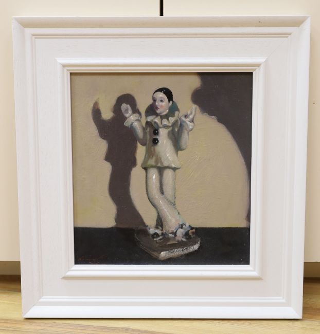 Ken Moroney (1949-2018), oil on board, Study of a Pierrot figurine, signed with Studio stamp verso, 31 x 29cm
