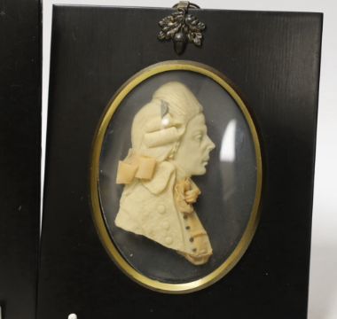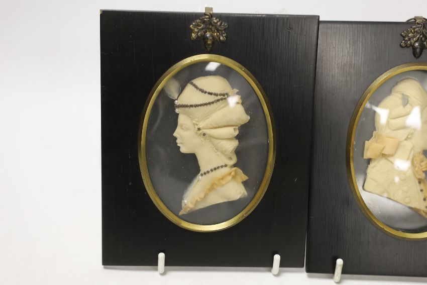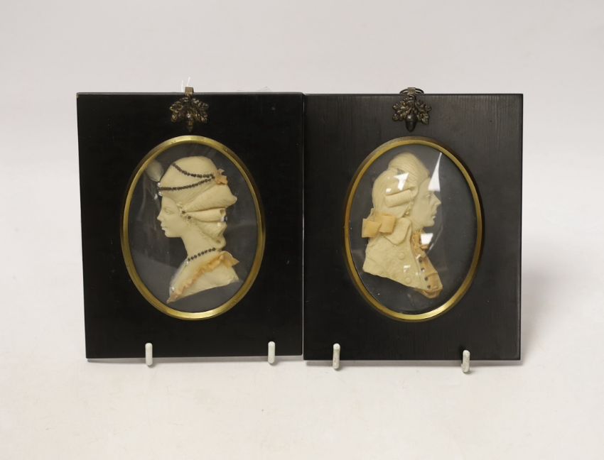 Attributed to Leslie Ray, pair of 20th century wax relief portraits of a lady and gentleman wearing 18th century dress, 15cm high including the frame