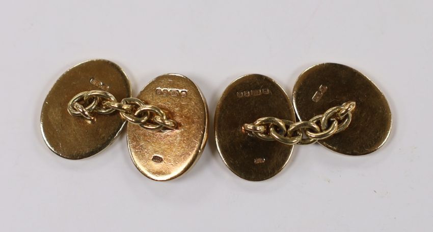 A pair of 1980's heavy 9ct gold oval cufflinks, with engraved crests, 16.2 grams.