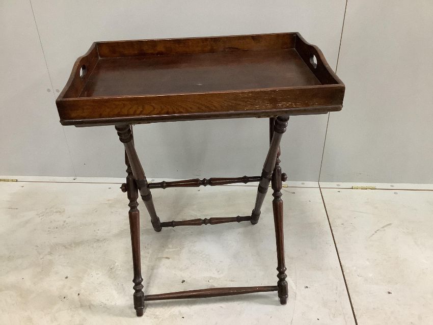 A late Victorian rectangular oak butler's tray on folding stand, width 65cm, depth 44cm, height 81cm