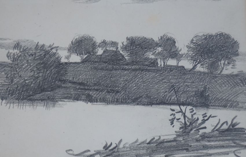 Attributed to William Strang RA (Scottish, 1859-1921), pencil sketch, River landscape, unsigned, details verso, 17 x 24cm