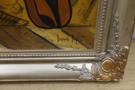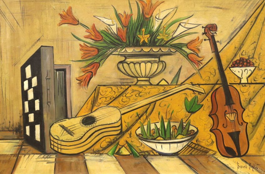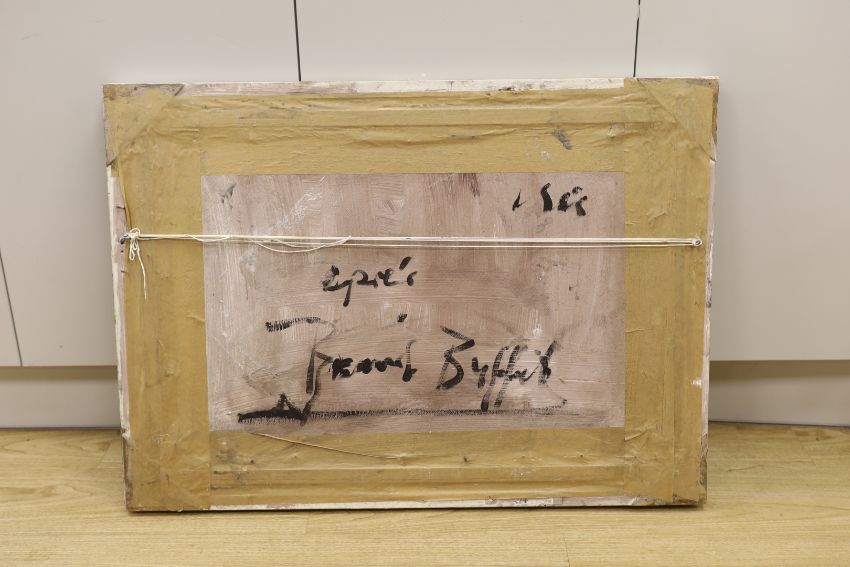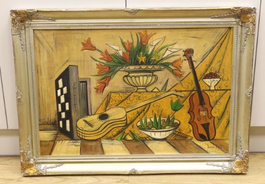 After Bernard Buffet (French, 1928-1999), oil on board, Surreal composition, still life flowers and instruments, 50 x 75cm