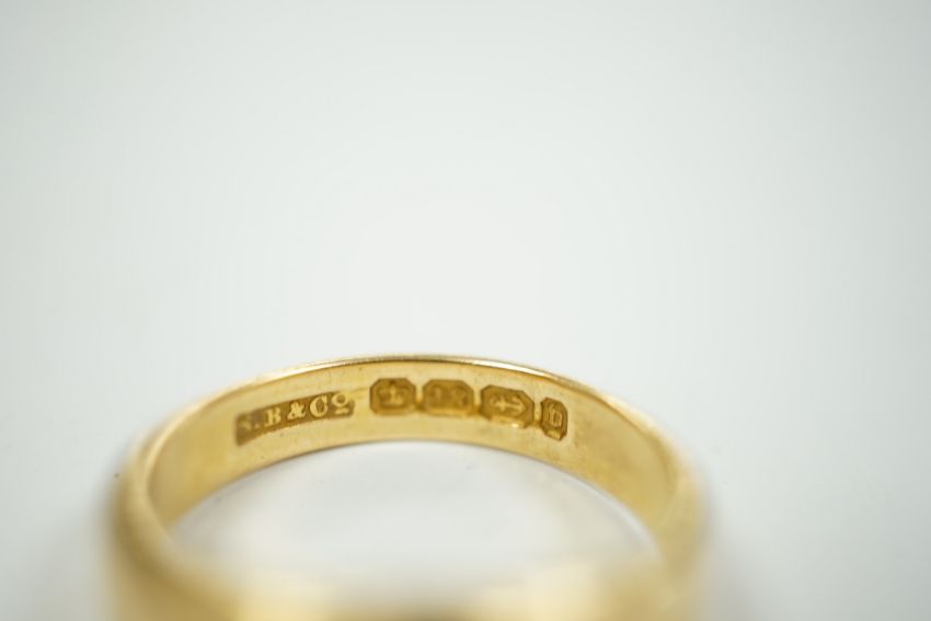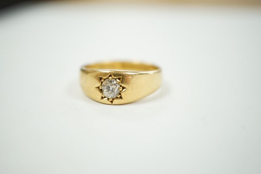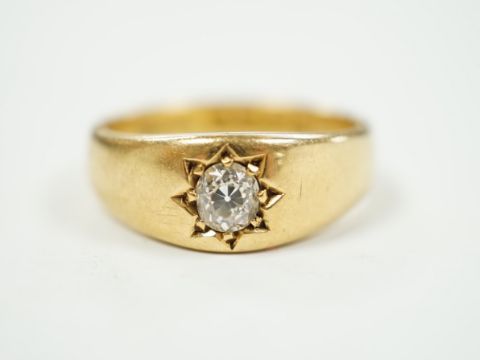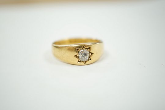 A late Victorian 18ct gold and gypsy set solitaire diamond ring, size Q, gross weight 7.5 grams.