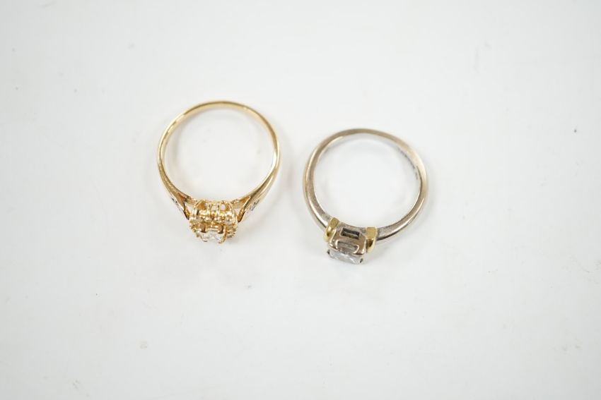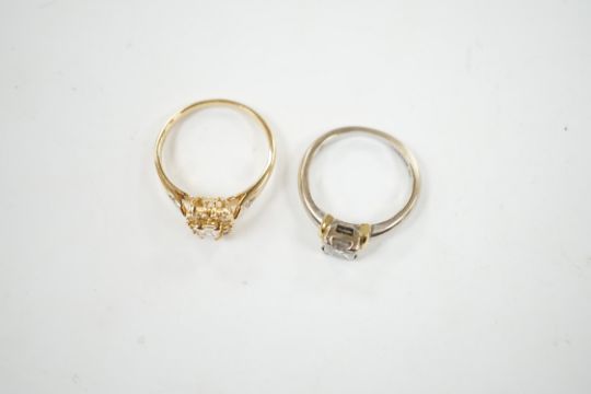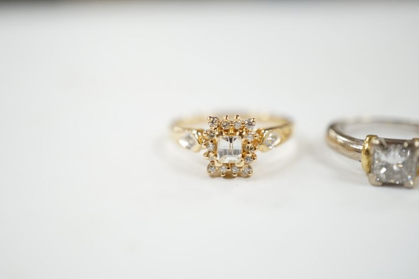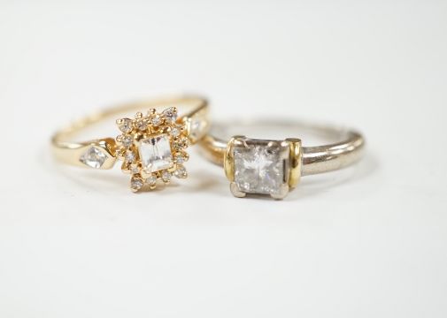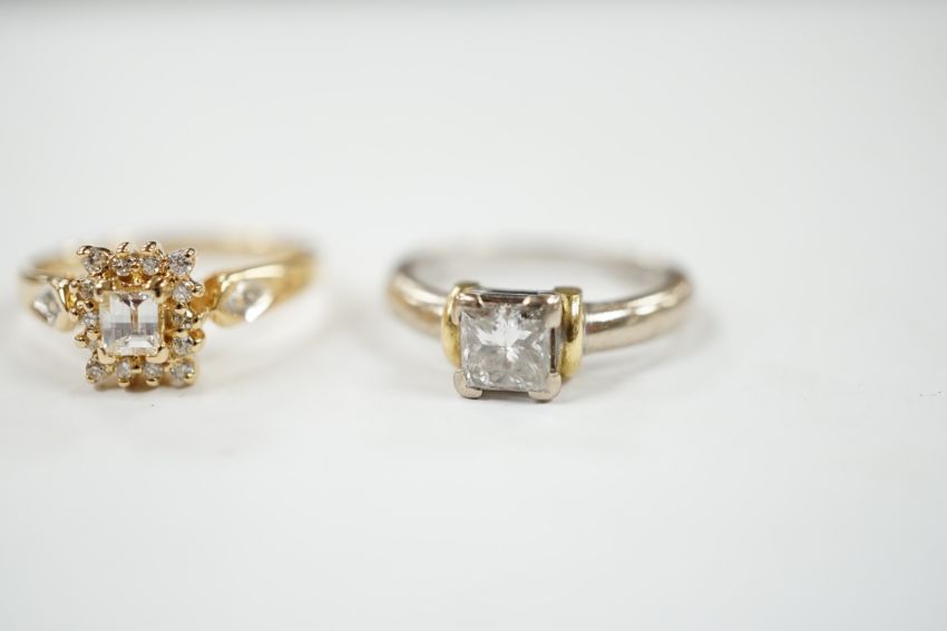 A modern two colour 18ct gold and solitaire princess cut diamond set ring, size K/L and one other modern 18ct gold and diamond set cluster ring, size N, gross weight 7.6 grams.