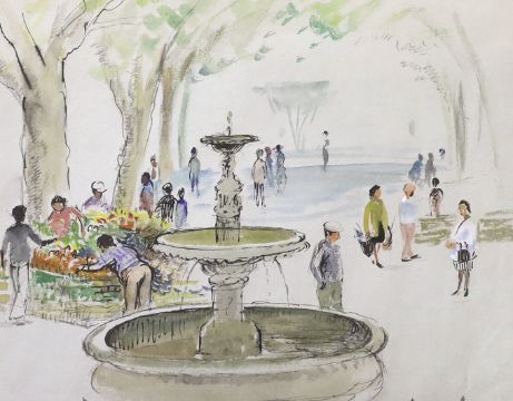 Hermione Hammond (1910-2005), ink and watercolour, French landscape with figures and water fountain, signed, inscribed and dated 5/73, 22 x 27cm
