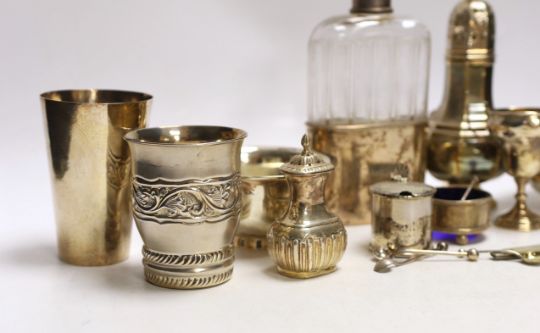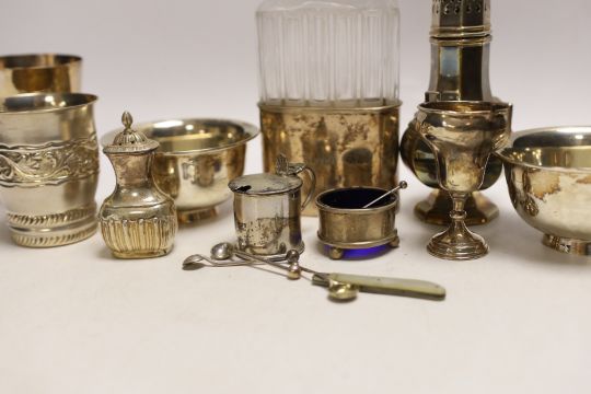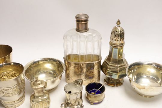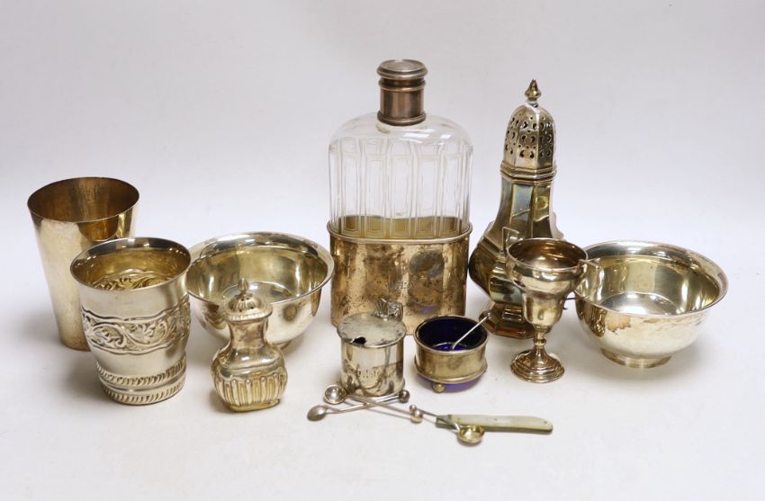 Sundry small silver including a George V sugar caster, small trophy cup, two small spoons, a fruit knife and three condiments, together with a pair of Chinese Wai Kee sterling bowls, two white metal vases and a French white metal mounted glass hip flask.