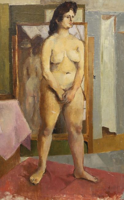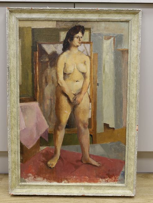 In the manner of Laura Knight (1877-1970), oil on board, Full length study of a nude woman, 75 x 49cm