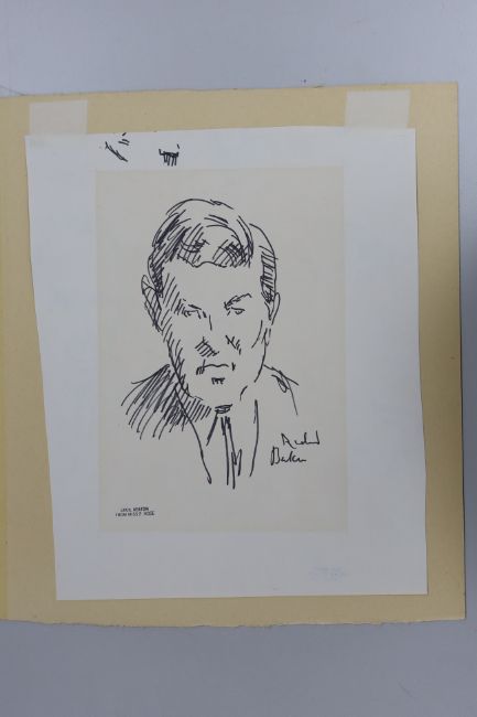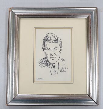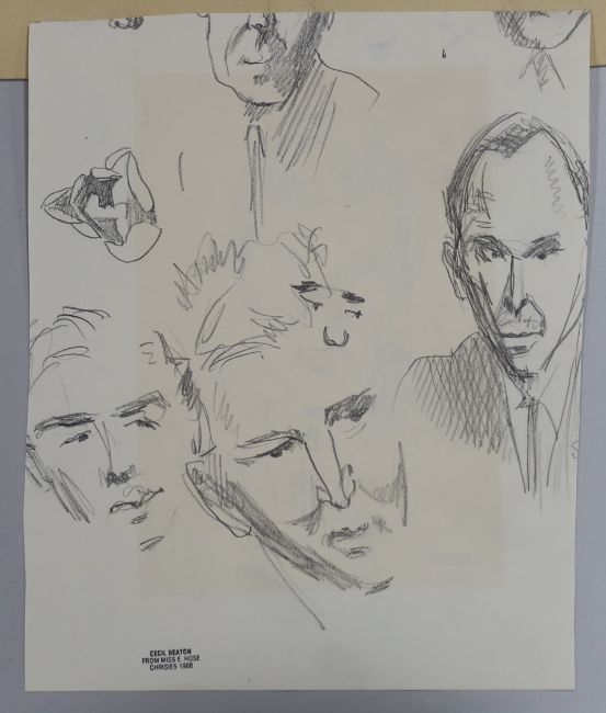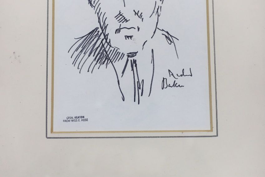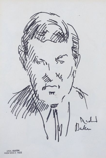 Cecil Beaton (1904-1980), pen and ink sketch, Portrait of newsreader Richard Baker, inscribed, with ‘Cecil Beaton from Miss E Hose’ stamp and pencil sketches verso, 19 x 12cm