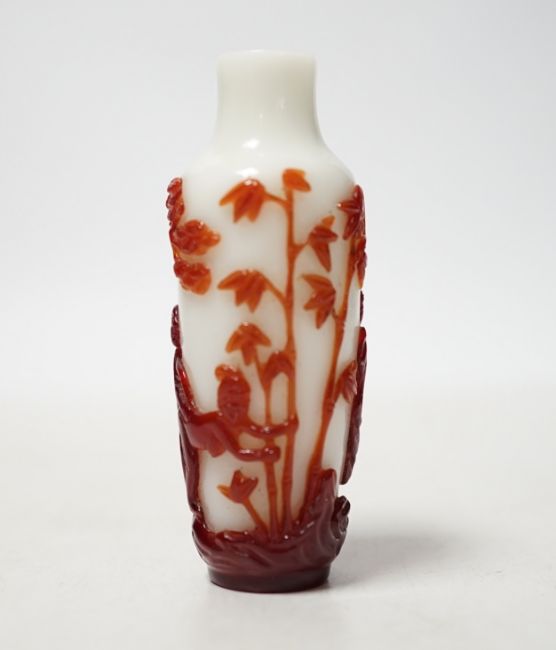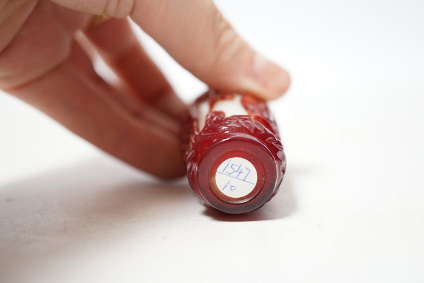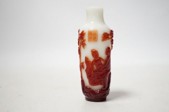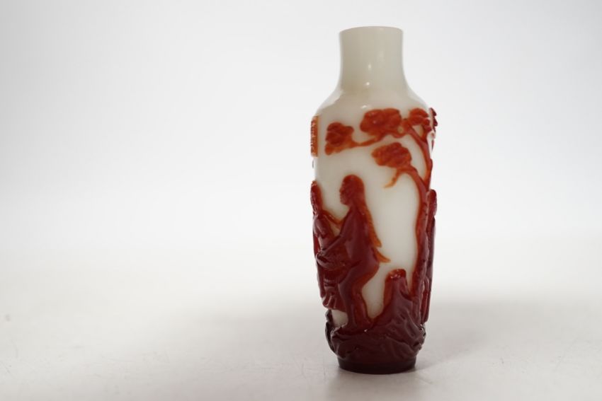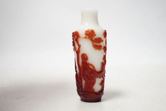 A Chinese ruby and white opaque glass erotic snuff bottle, early 20th century, 8cm high