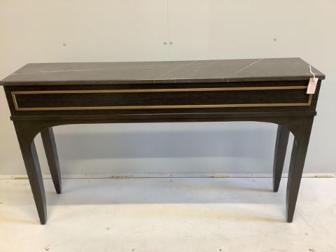 A custom made Decca Furniture black walnut console table with Livra marble top, width 140cm, depth 30cm, height 84cm No chips or cracks to the marble, no damage or repairs.