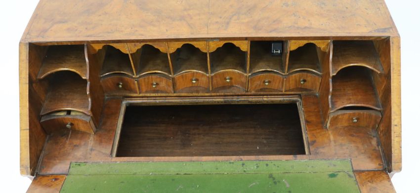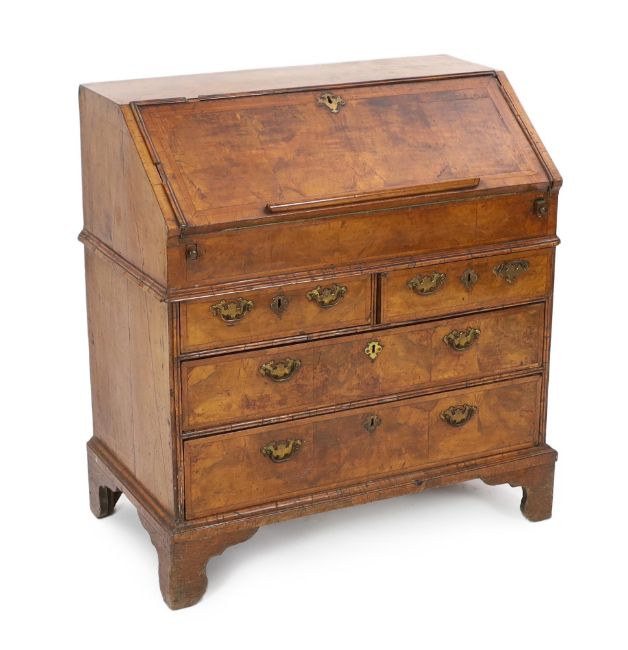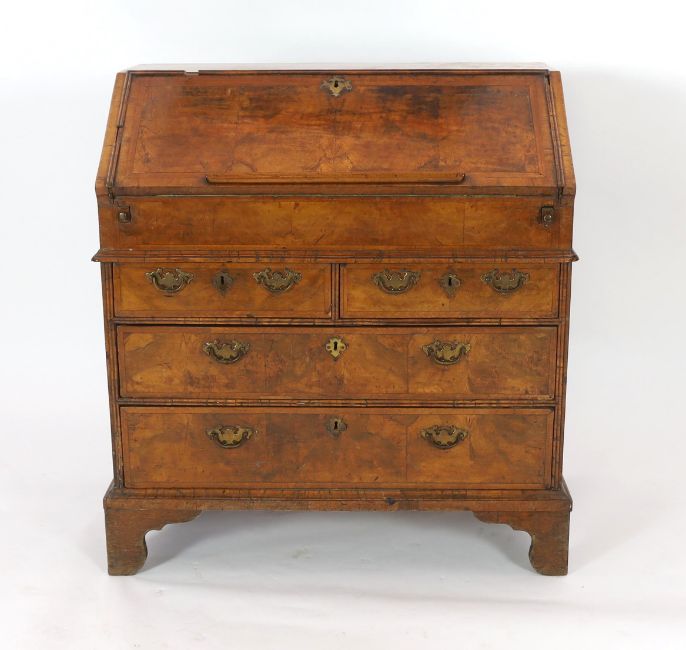 A George I figured walnut bureau, the fall enclosing an arrangement of pigeon-holes and short drawers over a well, above two short and two graduated long drawers, on bracket feet, 96cm wide, 52cm deep, 101cm high