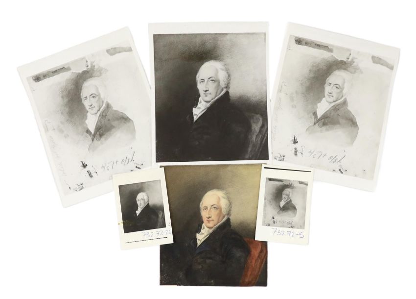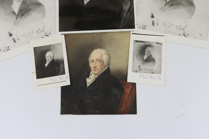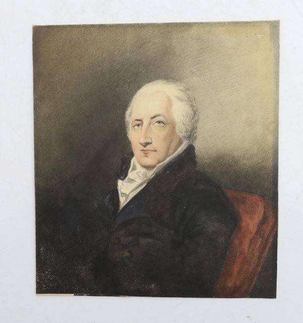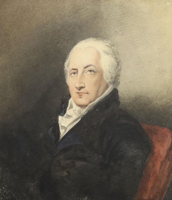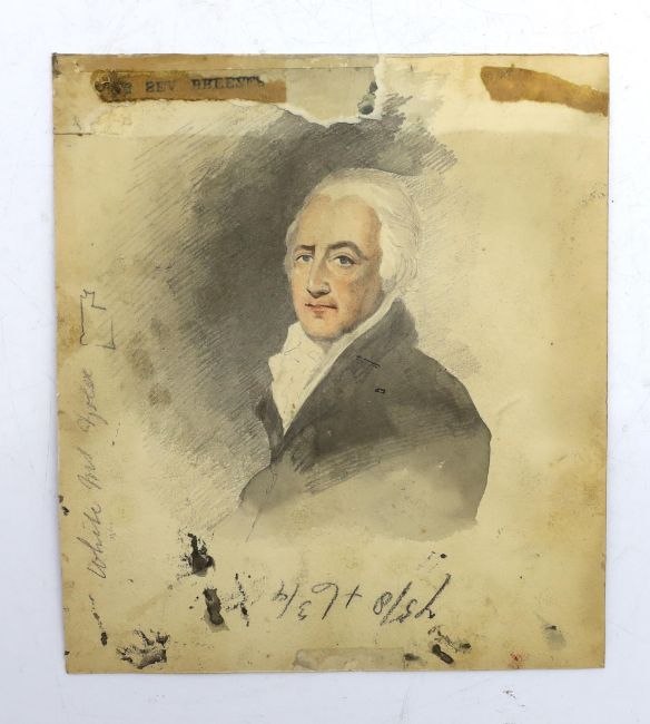Late 18th century English School - Portrait of Sir William Eden, later 1st Baron Auckland, watercolour on card, 20 x 18cm. A sketch of the sitter verso. Note: Sir William was father to fourteen children, including Emily Eden and her brother George Eden, 1st Earl of Auckland, the Governor-General of India (1836-1842)