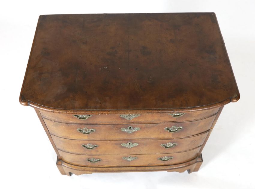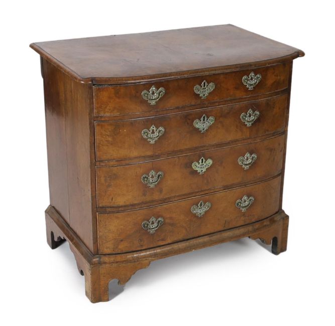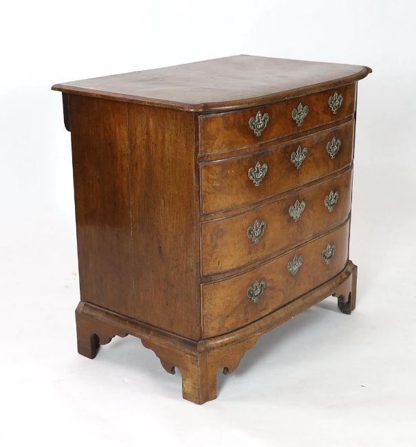 An 18th century Dutch walnut bowfront chest, with moulded top and four graduated long drawers, on shaped bracket feet, 89cm wide, 57cm deep, 84cm high