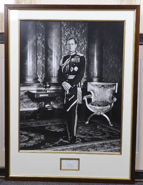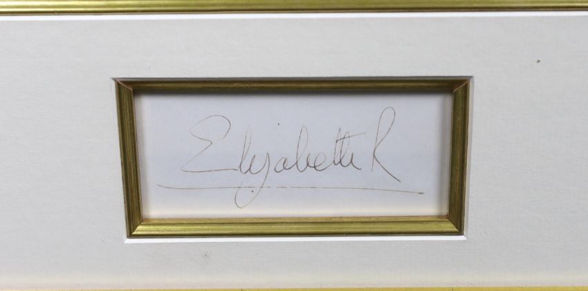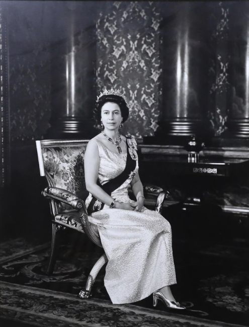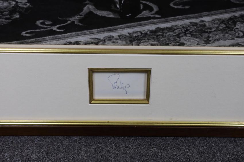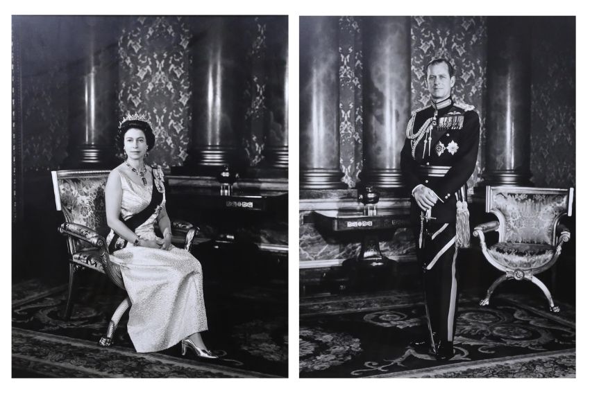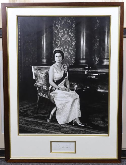 Anthony Buckley (British, 1912-1993) A pair of framed black and white portrait photographs of Queen Elizabeth II and Prince Philip, each with the sitters signature reserved within a cartouche within the framing, photographs 51 x 39cm, frames overall 69 x 51cm