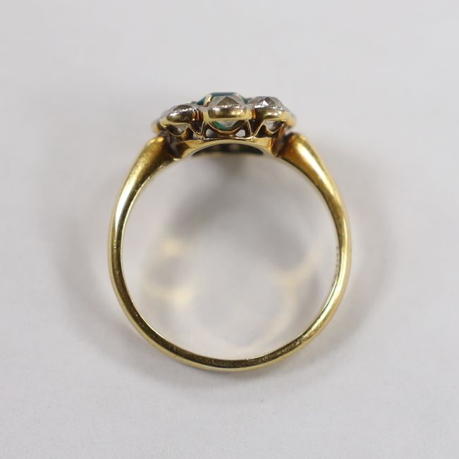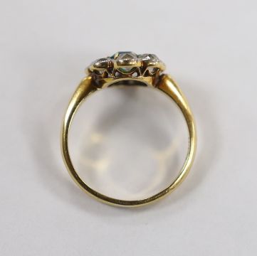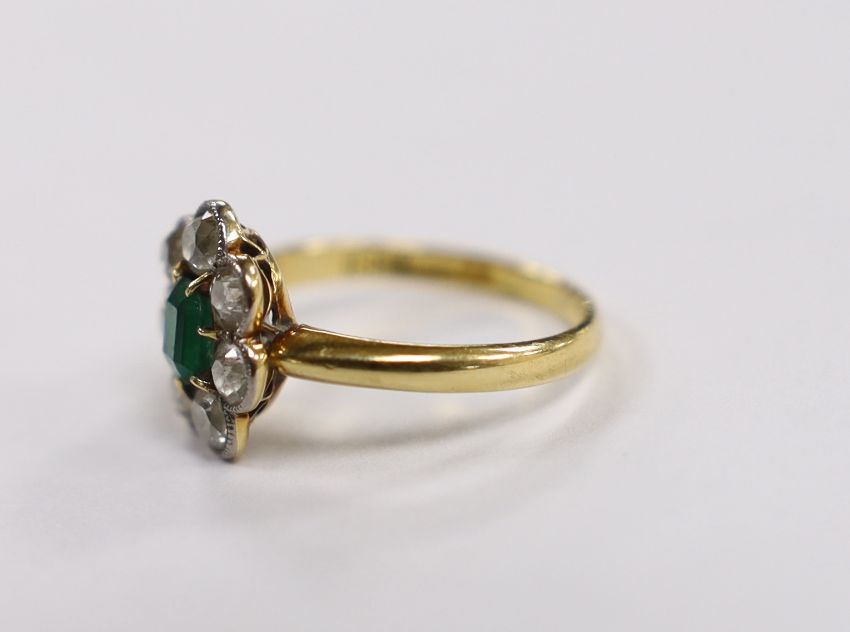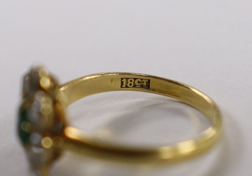 An 18ct, emerald and diamond set circular cluster ring, size L, gross weight 3.3 grams.