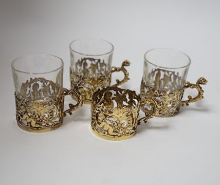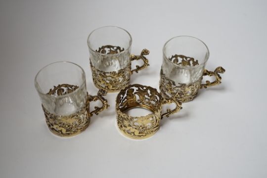 A set of four late Victorian pierced silver gilt coffee can holders, by William Comyns, Birmingham, 1897, with three glass inserts only,