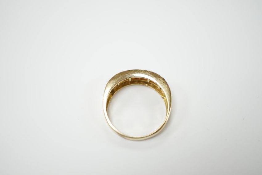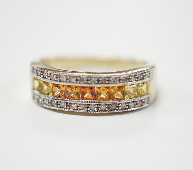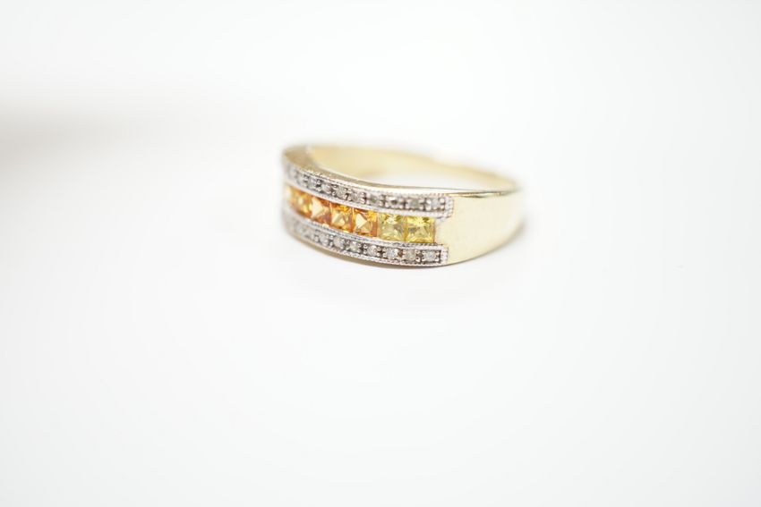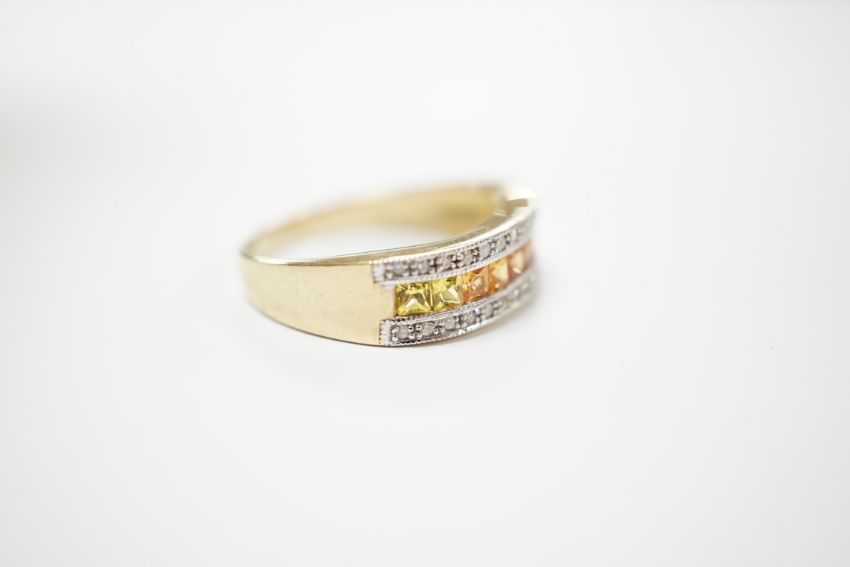 A modern 9ct gold, diamond, and two colour citrine? channel set half hoop ring, size P, gross weight 3.3 grams.