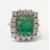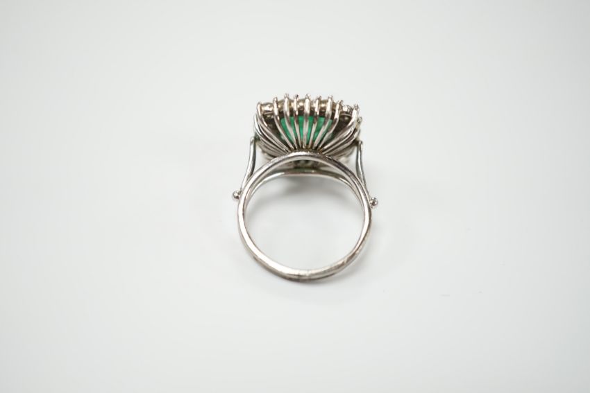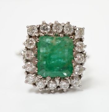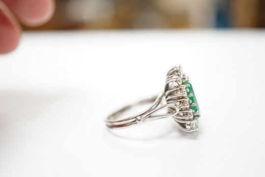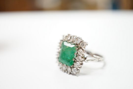 A white metal, emerald and diamond set square cluster ring, size I, gross weight 6.3 grams. There are several tiny hairlines cracks appearing across the stone in places, including the table facet. A few of the emerald claws need re-tipping. The shank has been re-sized at some point.
