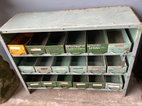 An industrial style metal workshop storage drawer unit, width 92cm, depth 31cm, height 72cm