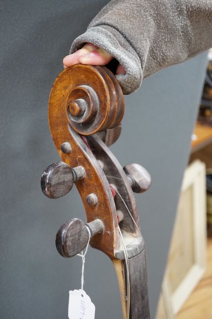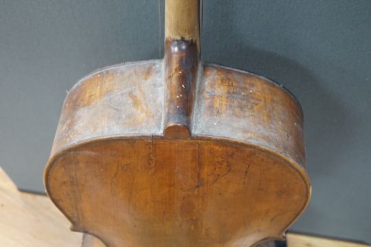 An early 20th century cello for restoration, indistinct internal label; ‘Restored by William J. Acton, Green Street, Forest Gate, London 1910’ length of body 72cm. There are cracks to the soundboard, the sound post is detached and there are other chips and damage. No obvious evidence of woodworm is present. The length of the fingerboard is 56.7cm, The stop length is 38.5cm and the sounding string length is approximately 67cm. Full length is approximately 120cm.Bottom edge of pegbox to top edge of main body 284mm.