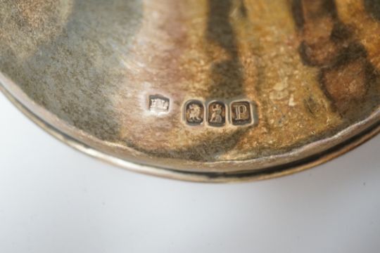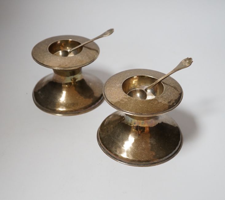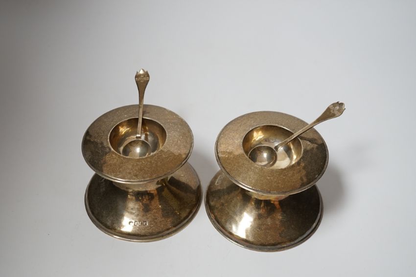 A pair of George V Britannia standard silver salts, of waisted form, with two matching spoons, Lambert & Co, London, 1910, height 79mm, 22oz.