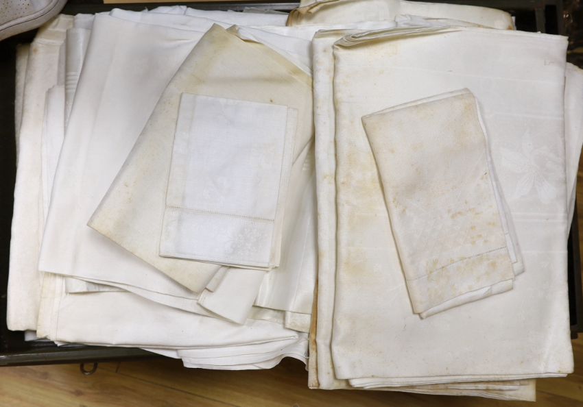 A tin trunk containing a large quantity of 19th and 20th century linen damask table cloths, together with a smaller quantity of linen sheets, trunk 86cm wide, 51cm deep, 31cm high