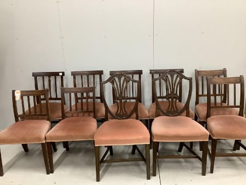 A harlequin set of eight George III Provincial mahogany dining chairs and two Hepplewhite style dining chairs