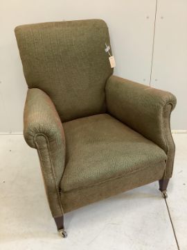 An Edwardian armchair, recently re-upholstered, width 76cm, depth 70cm, height 90cm