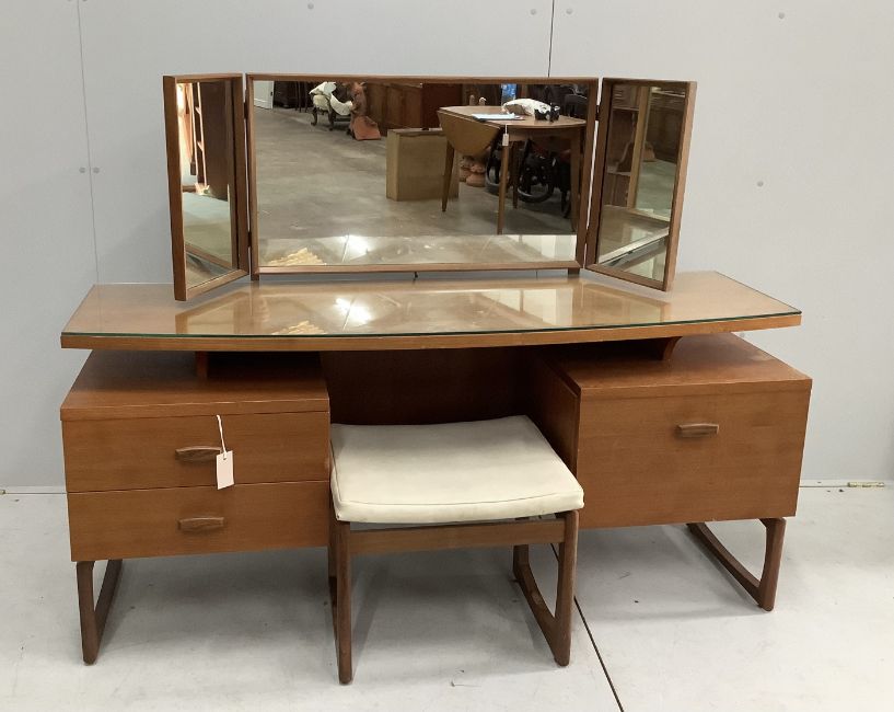 A mid century G Plan teak dressing table, width 152cm, depth 47cm, height 117cm and stool