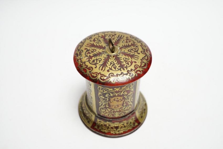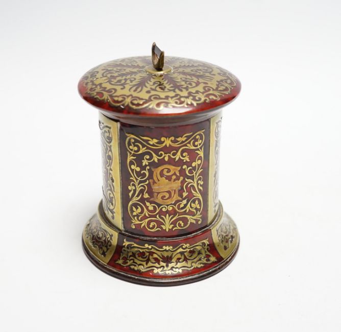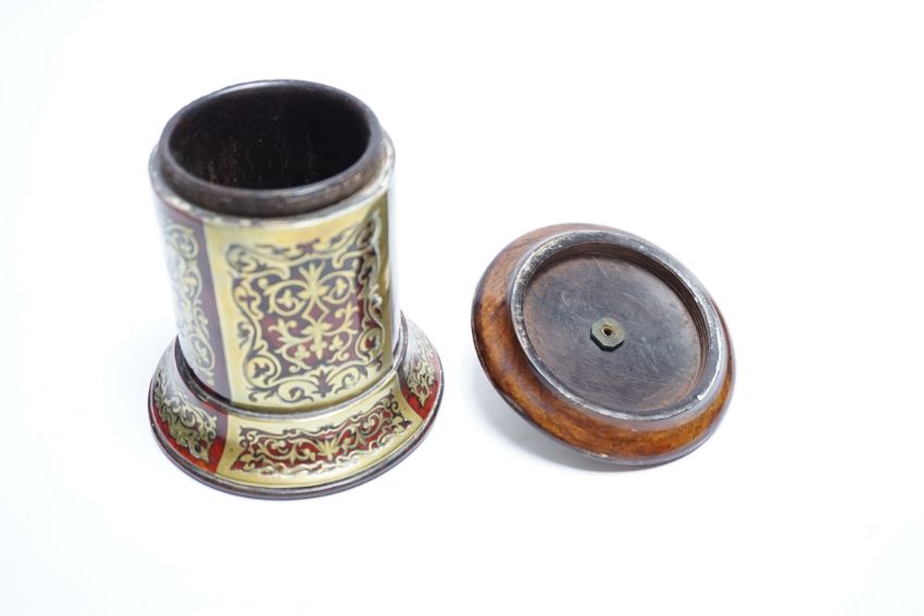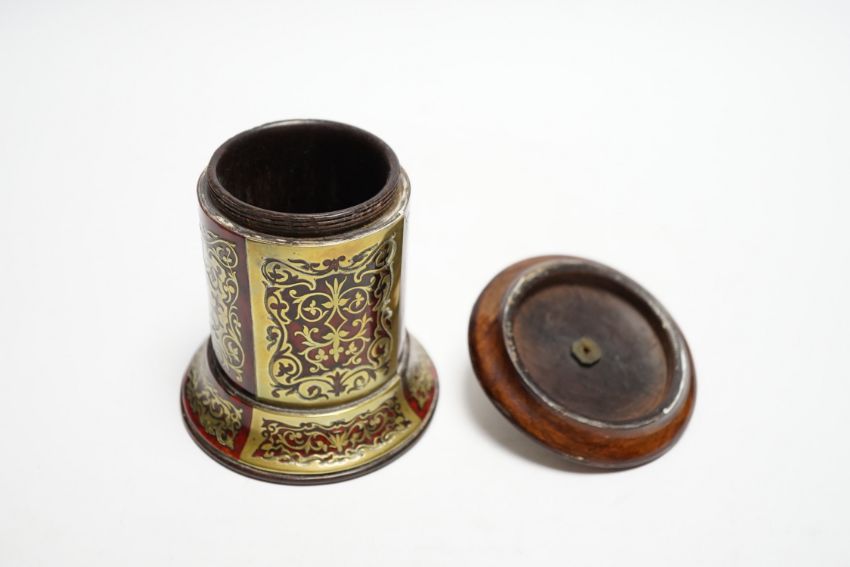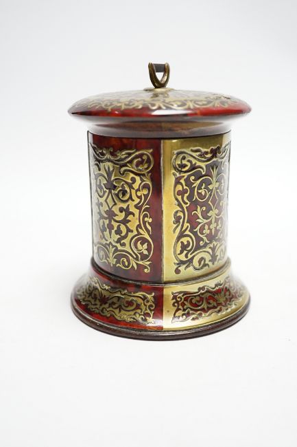 A 19th century French Boulle work cylindrical string box and cover, 12cm high Generally good condition, with some minor wear and rubbing commensurate with age.