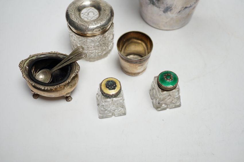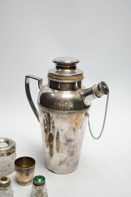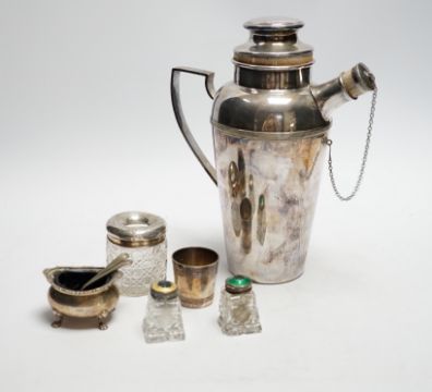A plated cocktail shaker and sundry small silverwares including silver salt with Bristol blue glass liner, largest 23cm high