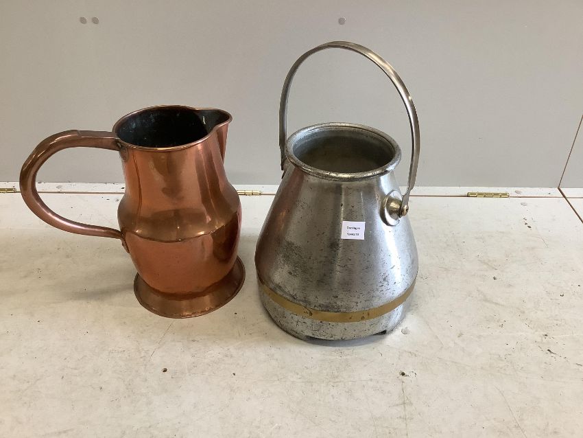 A large Victorian copper jug and an aluminium dairy bucket, larger height 40cm