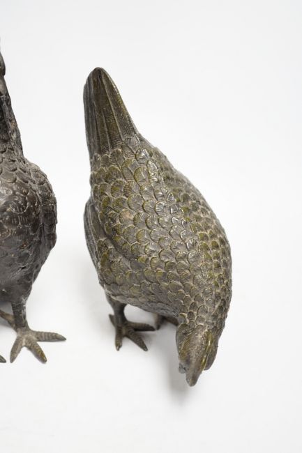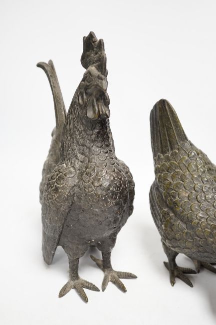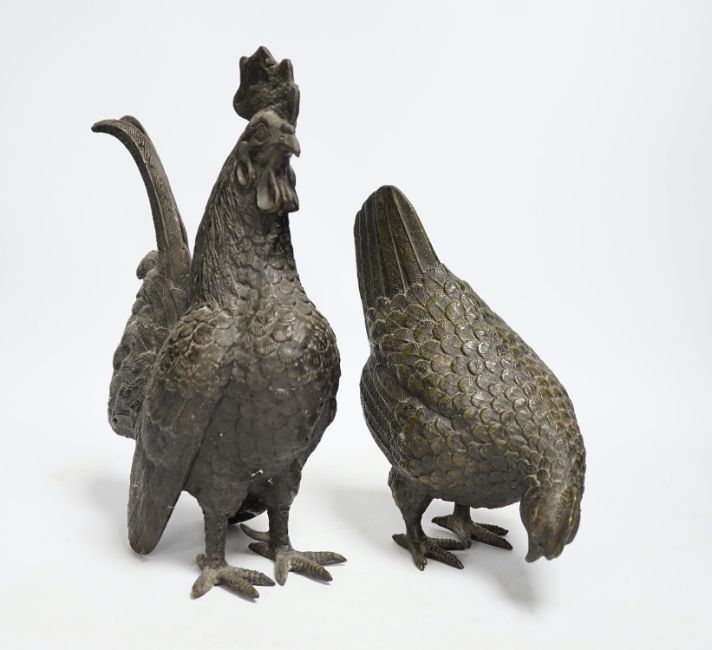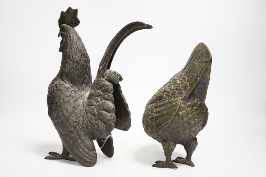A pair of modern bronze models of a cockerel and chicken, largest 29cm high