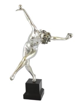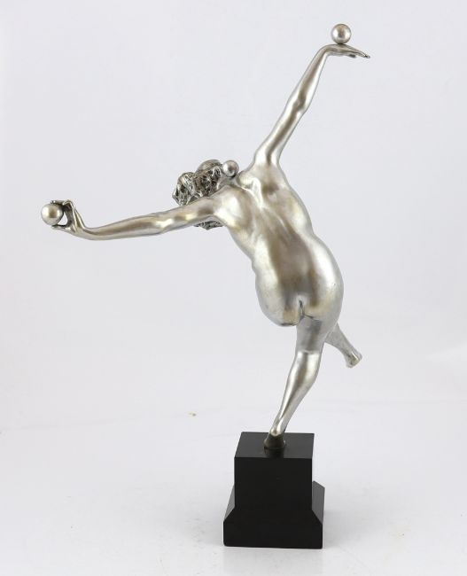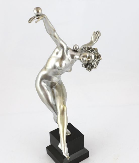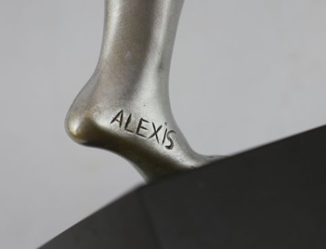 Attributed to Claire Colinet, an Art Deco silvered bronze figure of a nude acrobatic dancer, signed on the foot Alexis Rudier (b.1925), standing upon a black marble plinth, overall 53cm high
