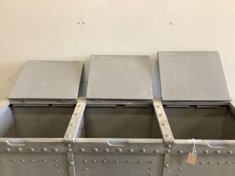 A painted faux iron studded triple hinged top trunk, width 144cm, depth 41cm, height 92cm