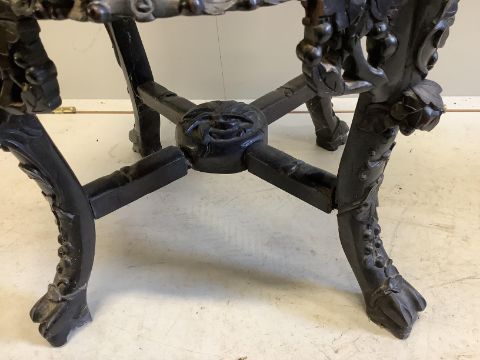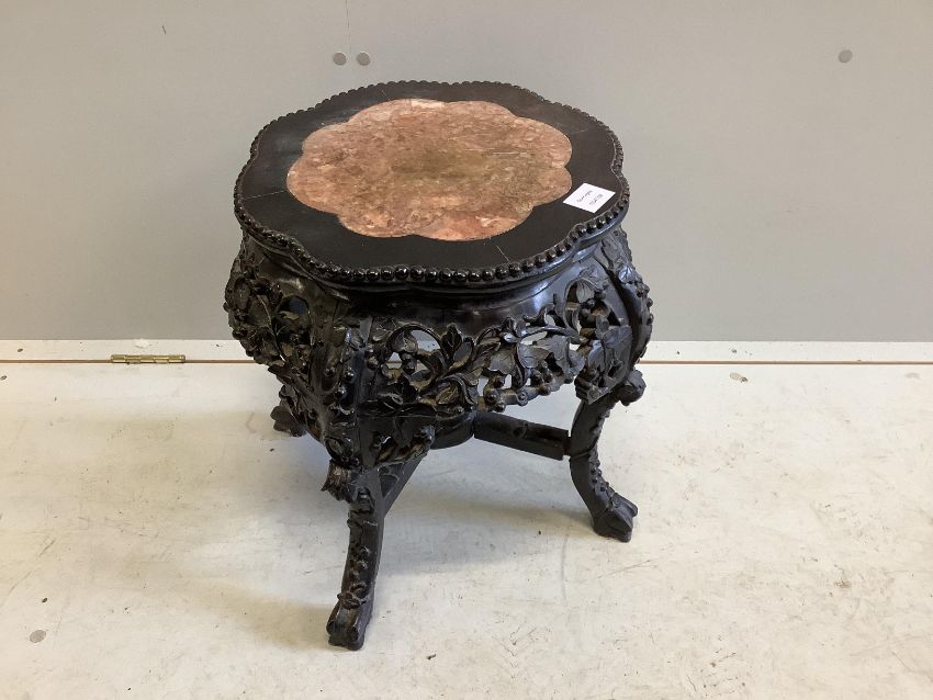 A Chinese circular hardwood rouge marble topped jardiniere stand, diameter 42cm, height 47cm Some light scratches to inset rouge marble; the carved and inlaid apron is made up of four sections, one of which is a little loose, not serious; one small section of the apron carving is missing, approx. 20x5mm; two stretchers could be tighter to the leg, not serious.  Generally good.