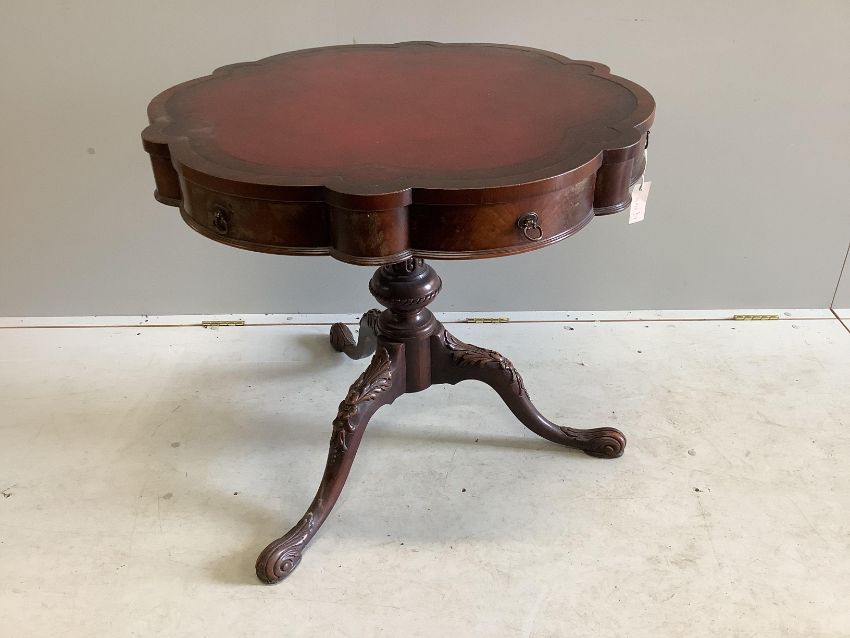A Victorian style circular mahogany tripod centre table, with leather inset top, diameter 79cm, height 71cm
