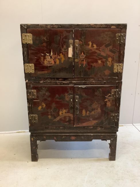 A Chinese lacquered two section cabinet on stand, width 84cm, depth 51cm, height 128cm
