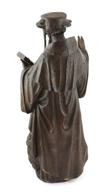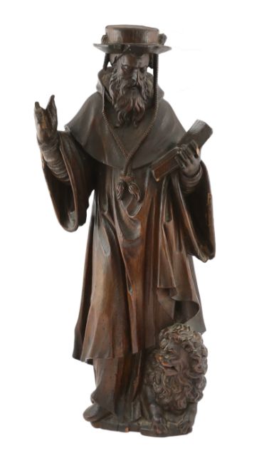 A 19th century carved elm figure of St. Jerome reading from the bible with a lion at his feet, 32cm wide, 79cm high