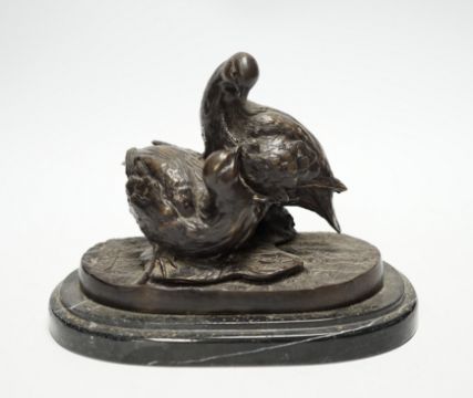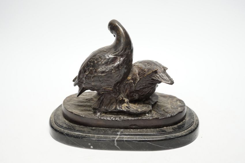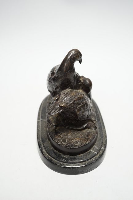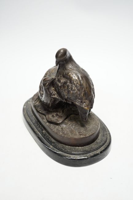 After Christopher Fratin (1801-1864) a bronze figure group of partridges, on marble base, 19cm wide